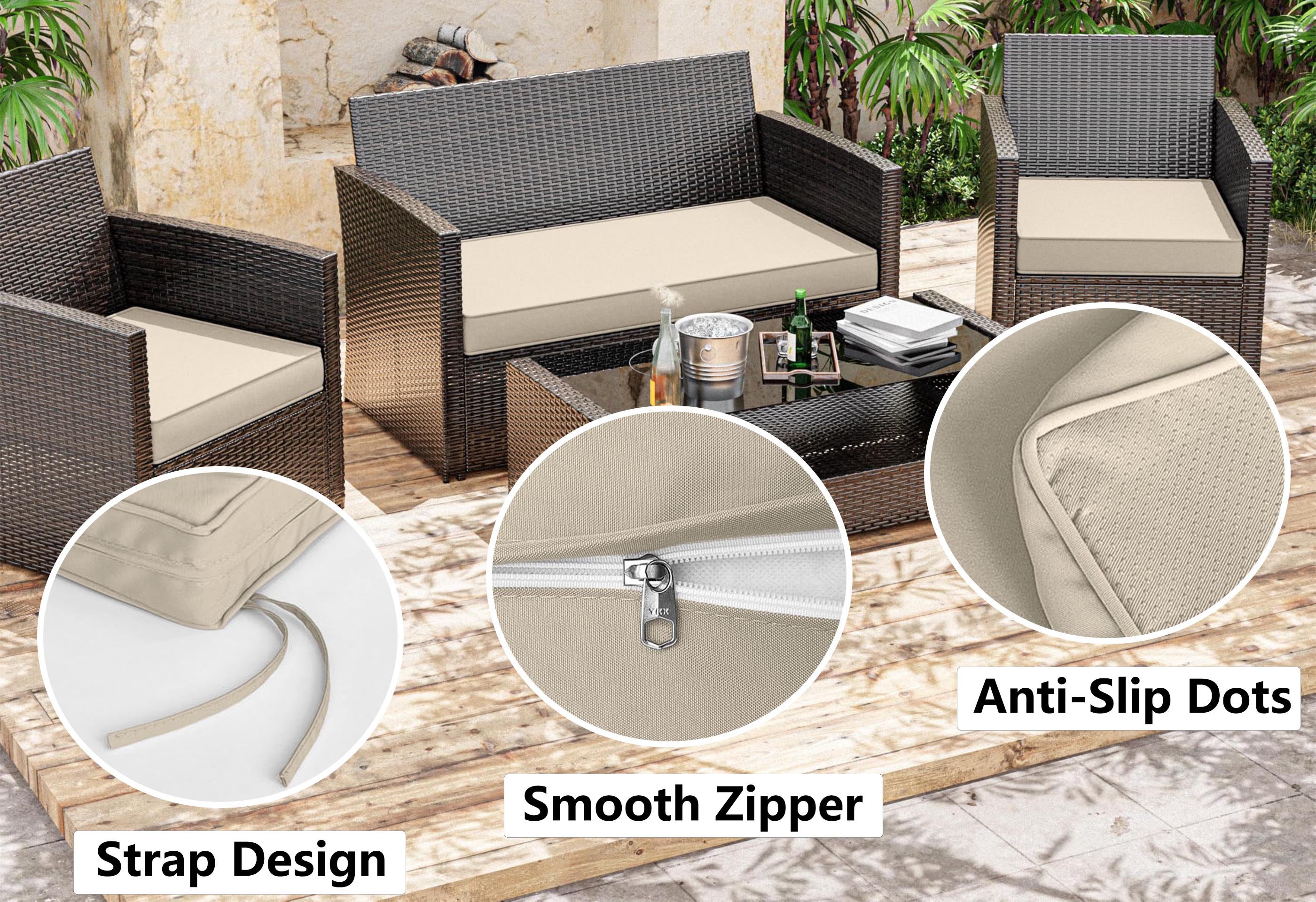 The Snubbull cushion cover deflects light rain without issue because considering the skin comfort, it only features a splash-proof function, not completely 100% waterproof. Spills, stains or outdoor moisture just bead up on the patio cushion cover, which can be brushed off quickly with a towel. The zipper strap also prevents light rain from entering through the zipper. Thus, using a chair cover or bringing cushions inside during extended downpours helps maintain the foam's integrity and prevents moisture buildup.